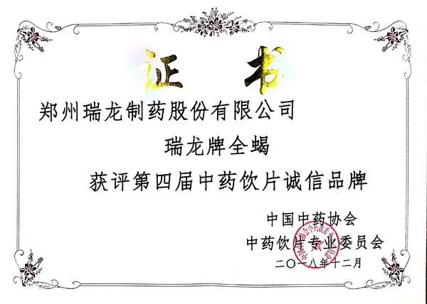 2018年,瑞龍牌“全蝎”被中國中藥協(xié)會中藥飲片專業(yè)委員會評為“第四屆中藥飲片誠信品牌”。