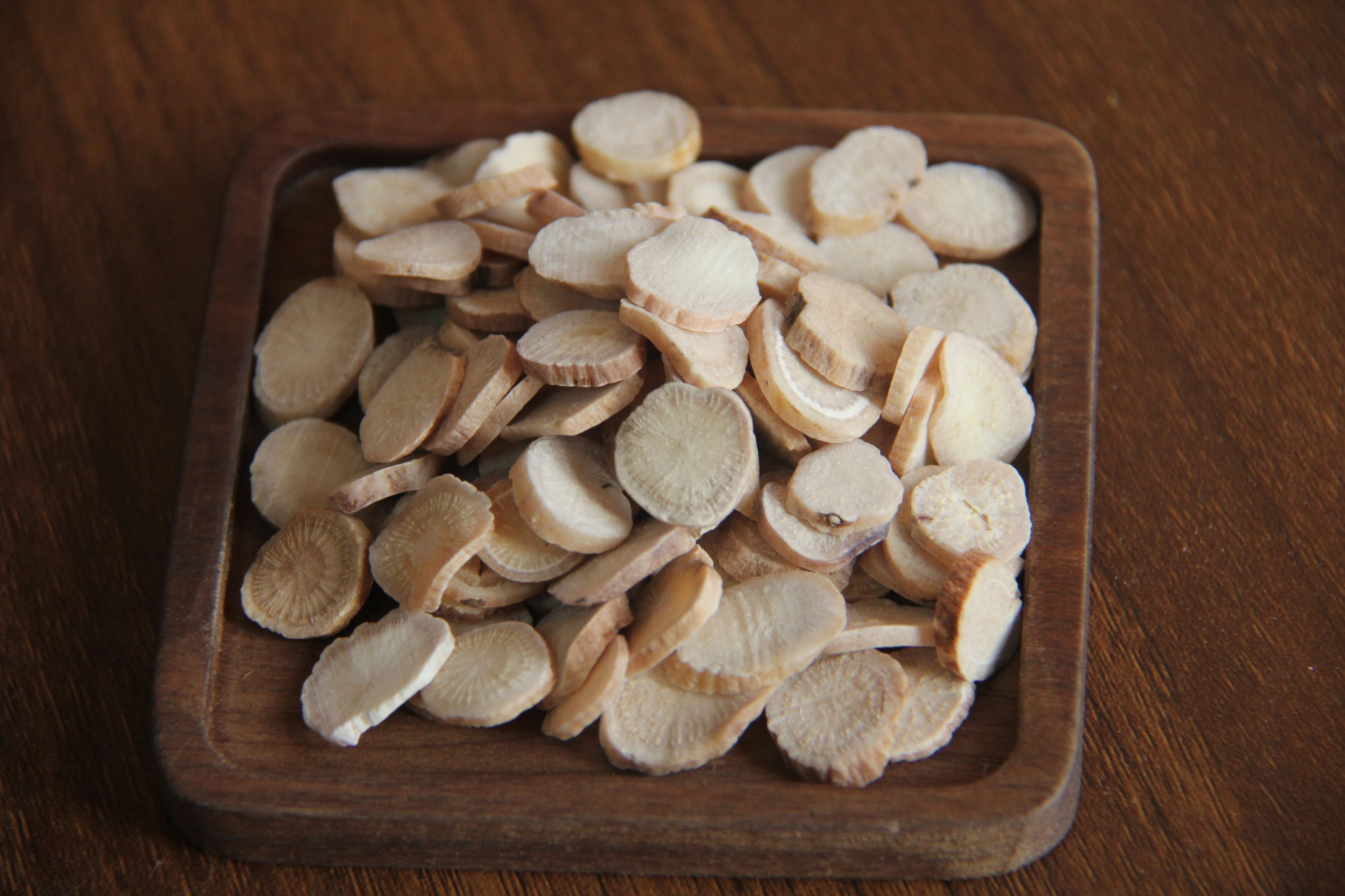 芍藥根,毛茛科植物,干燥后稱為白芍。主要產(chǎn)自河南省虞城縣等地,是當(dāng)?shù)氐奶厣a(chǎn)品。通常在夏秋季節(jié)采挖,洗凈后去除兩端及細根,經(jīng)過沸水煮制或去皮后煮制,曬干,切成薄片。其中,質(zhì)地堅實、顏色接近白色、粉性充足的白芍品質(zhì)最佳。